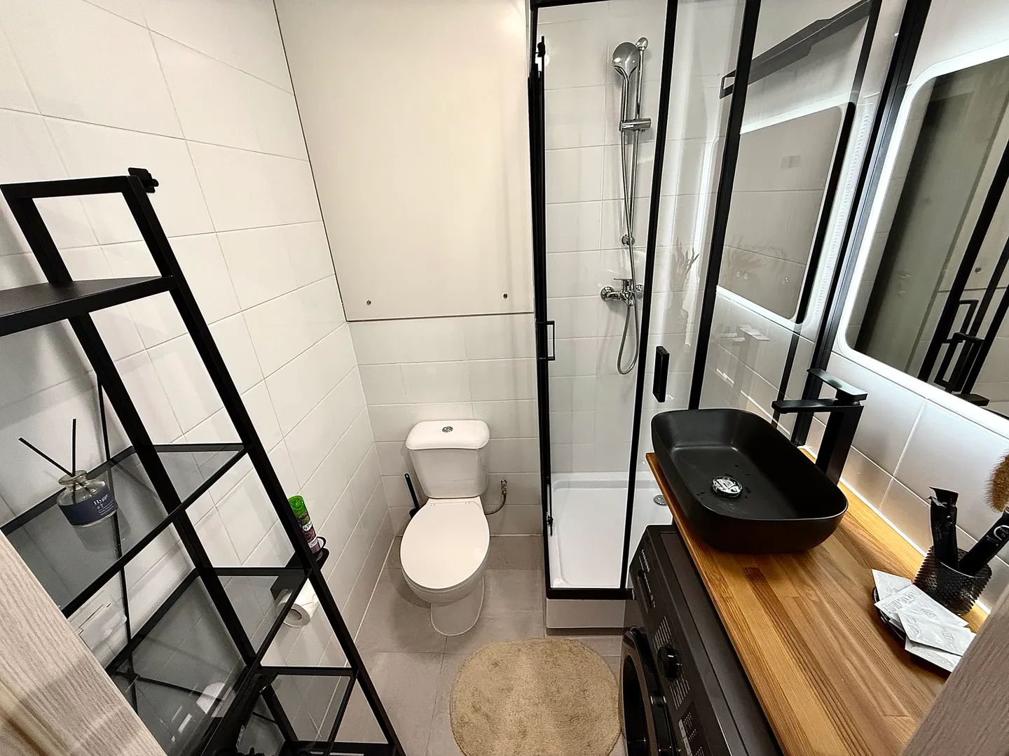 Существенный недостаток, не уходила вода в душевой кабине, невозможно было нормально принять душ. Сообщил хозяевам, обещали прочистить, но этот момент немного подпортил общее впечатление. Несущественно то, что раковина высоко, но там снизу стиральная машина, поэтому видимо других вариантов не было.