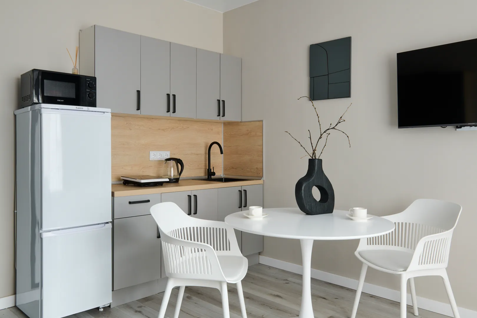 - Кухня с холодильником, плитой, микроволновкой, чайником и посудой.