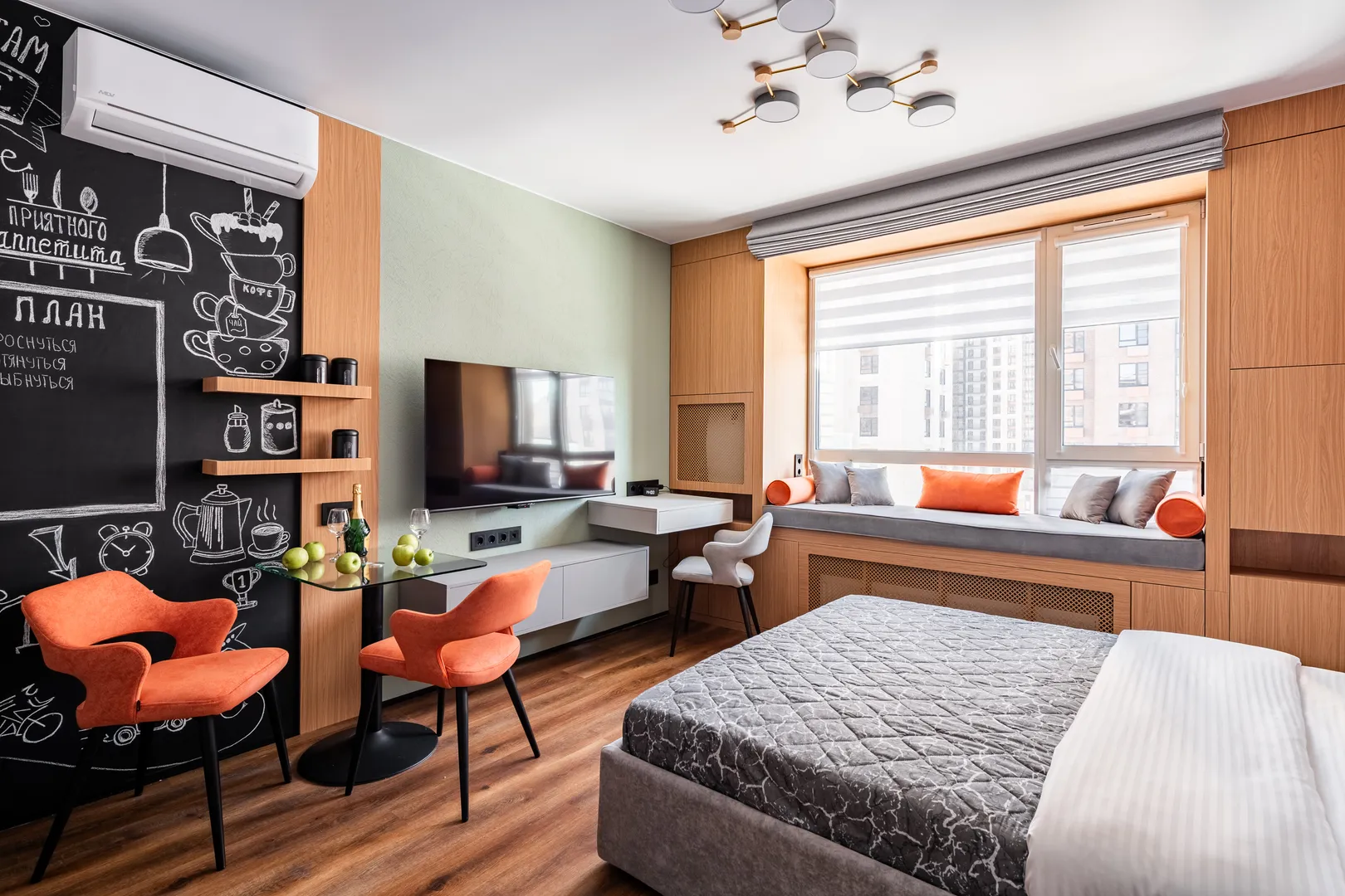 - Удобства: Кровать с ортопедическим матрасом и шторы блэк-аут - выспитесь