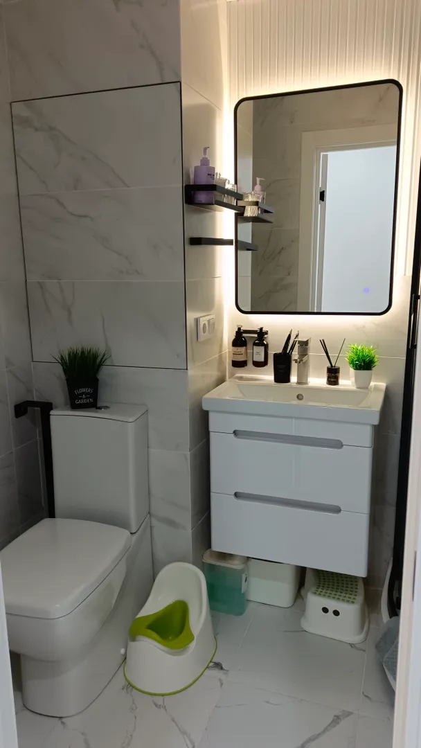 Санузел с гигиеническими принадлежностями (гель для душа, шампунь, бальзам для волос, крем для рук, крем для тела, щетки и паста. Полотенца для тела, ног, лица, туалетная бумага, порошок, гель для стирки, кондиционер для белья, кислородный отбеливатель).