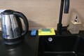 Кухонная зона оснащена техникой для приготовления пищи: микроволновая печь, холодильник, плита, чайник, столовые приборы, кастрюля, обеденный стол.