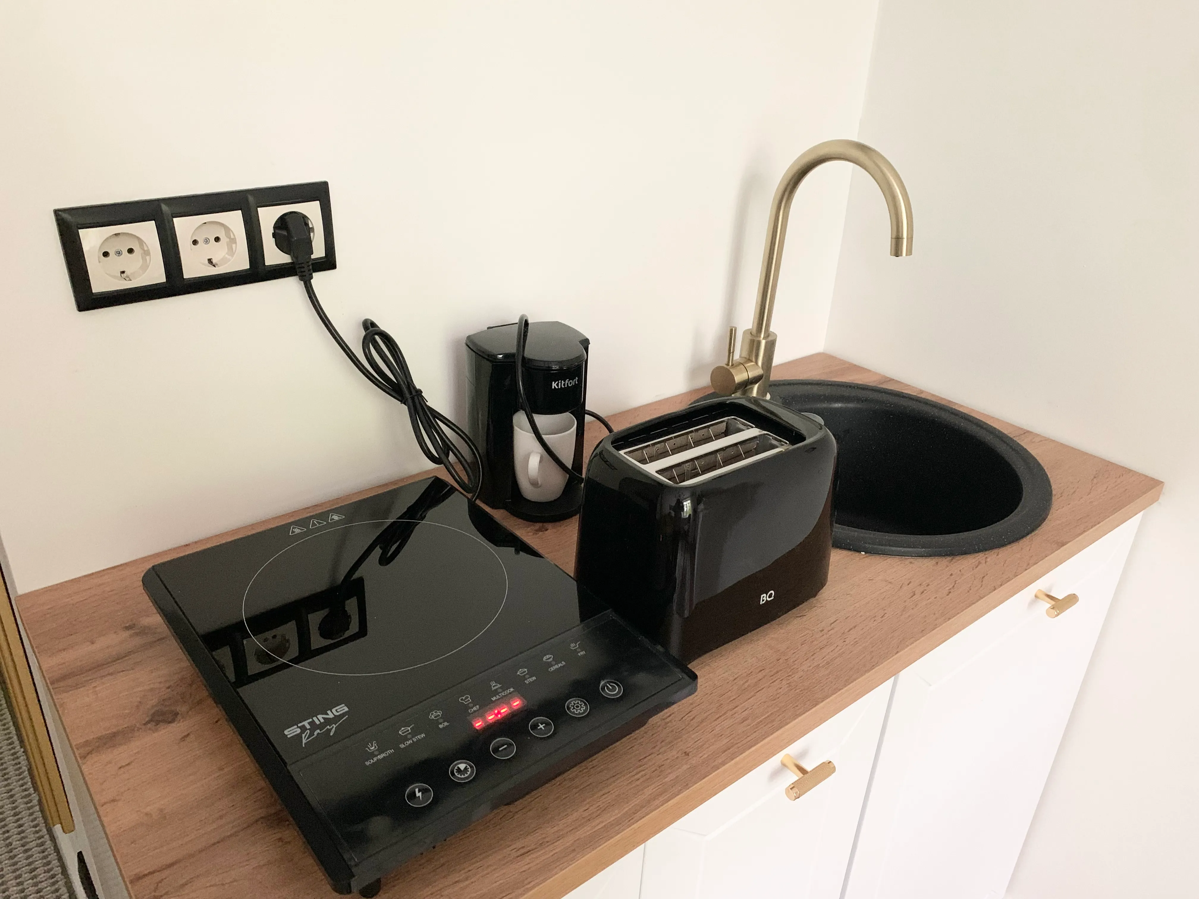 Чайник, кофемашина, тостер, холодильник, микроволновая печь, переносная варочная панель, прочая кухонная утварь.