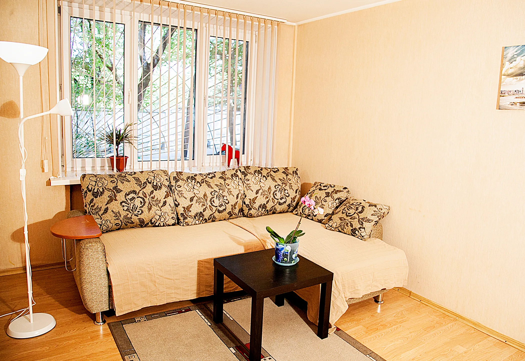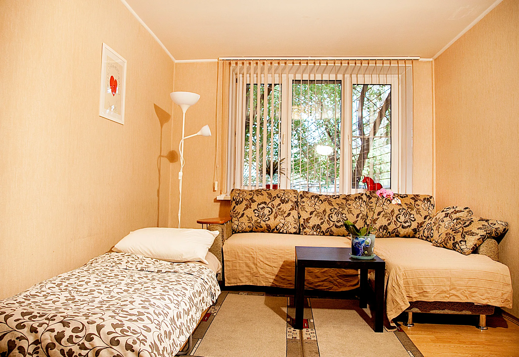 Спальная комната с двуспальной кроватью, столиком-зеркалом и шкафом-купе. Гостиная с раскладным двуспальным диваном, телевизором, журнальным столиком и всей необходимой мебелью. При необходимости, можно использовать две дополнительные удобные раскладные кровати с ламелями и матрасами. Современная отдельная кухня наполнена всем необходимым кухонным оборудованием. В кухонный гарнитур встроена большая и вместительная стиральная машина. Ванная комната оснащена душевой кабиной и сантехникой.