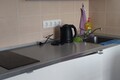 Кухонная зона с электрической плитой, холодильником, микроволновой печью