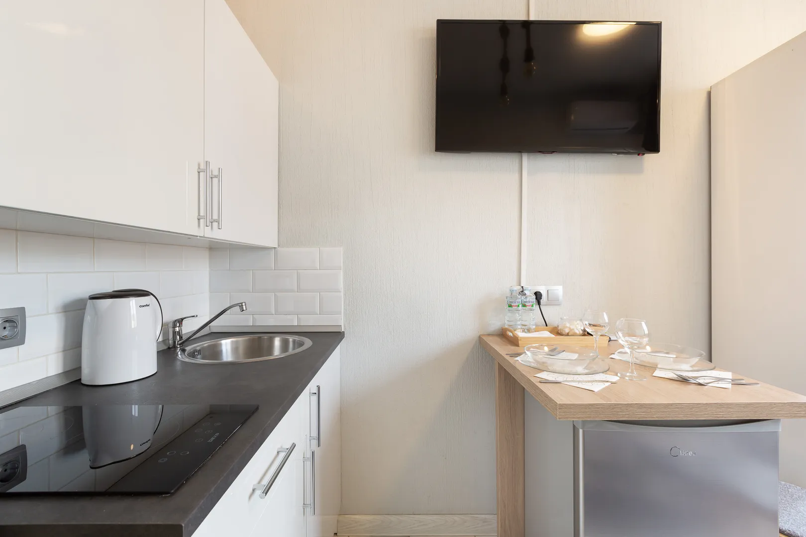 Полноценная кухня с варочной поверхностью, холодильником, электрочайником и всей необходимой посудой и кухонной утварью