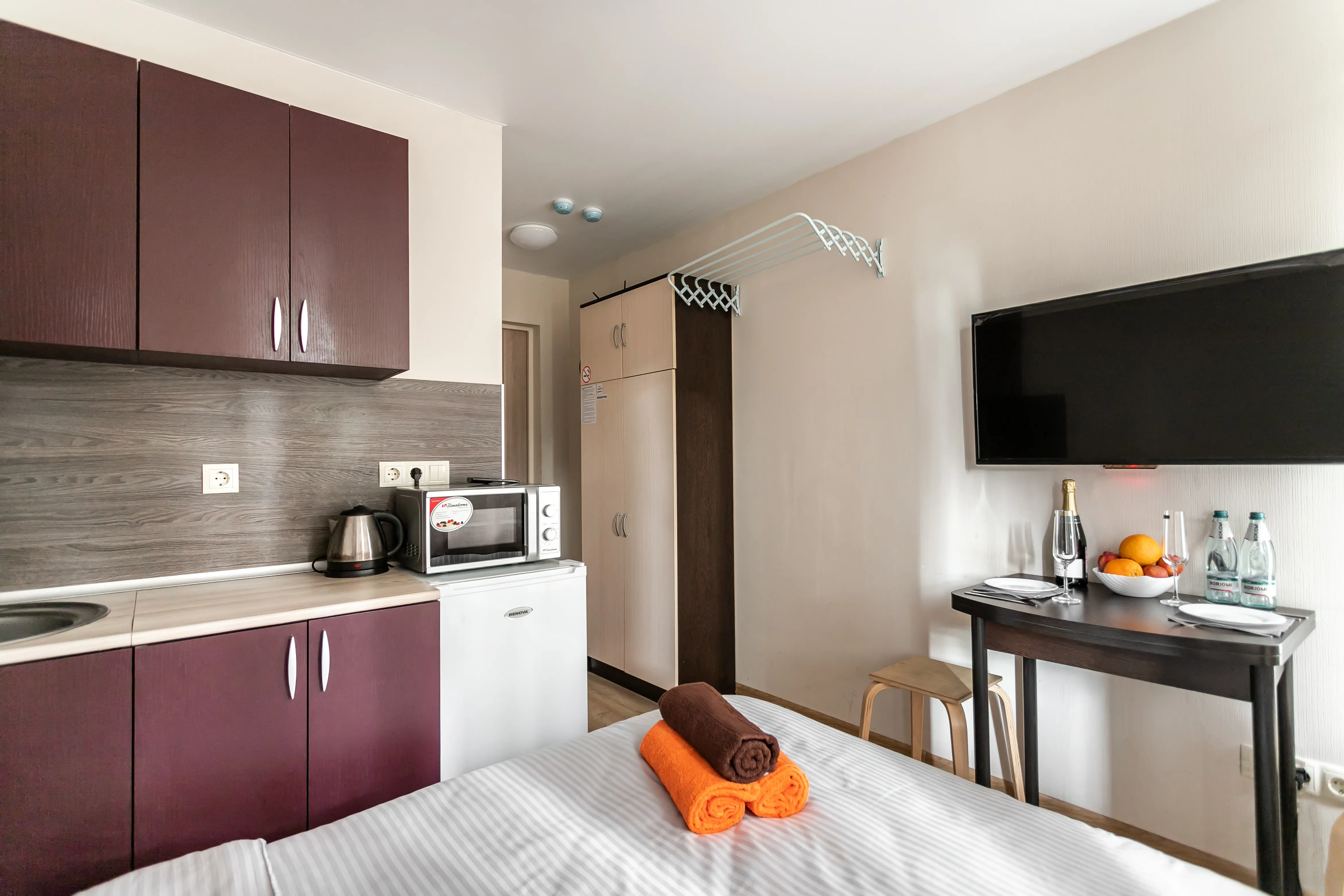 Квартира реально очень маленькая, на фото кажется больше. Между кроватью и кухонной мебелью узкая дорожка, аналогично до столика под ТВ. Сама кровать впритык к окну и батарее. Очень плохо уходит вода в раковине в ванной. Просто помыть руки и раковина до краёв. Жидкое мыло разбавлено до состояния воды. Ну и грязновато, везде, к сожалению.
