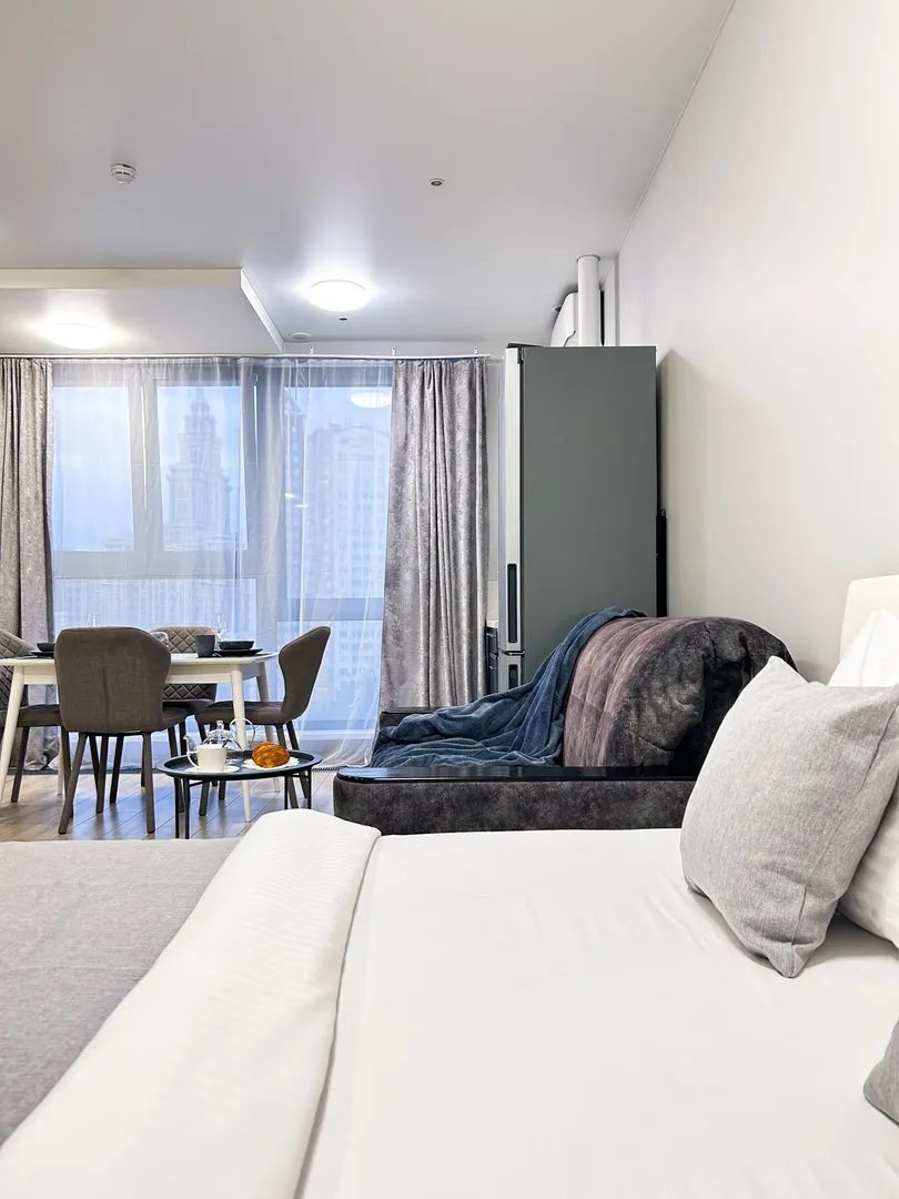 Удобное местоположение. Общественный транспорт, парковка, магазины, общепит - всё под рукой. Бесконтактное заселение. Отдельный обеденный стол на 4-х человек, что редкость для студий небольших размеров.