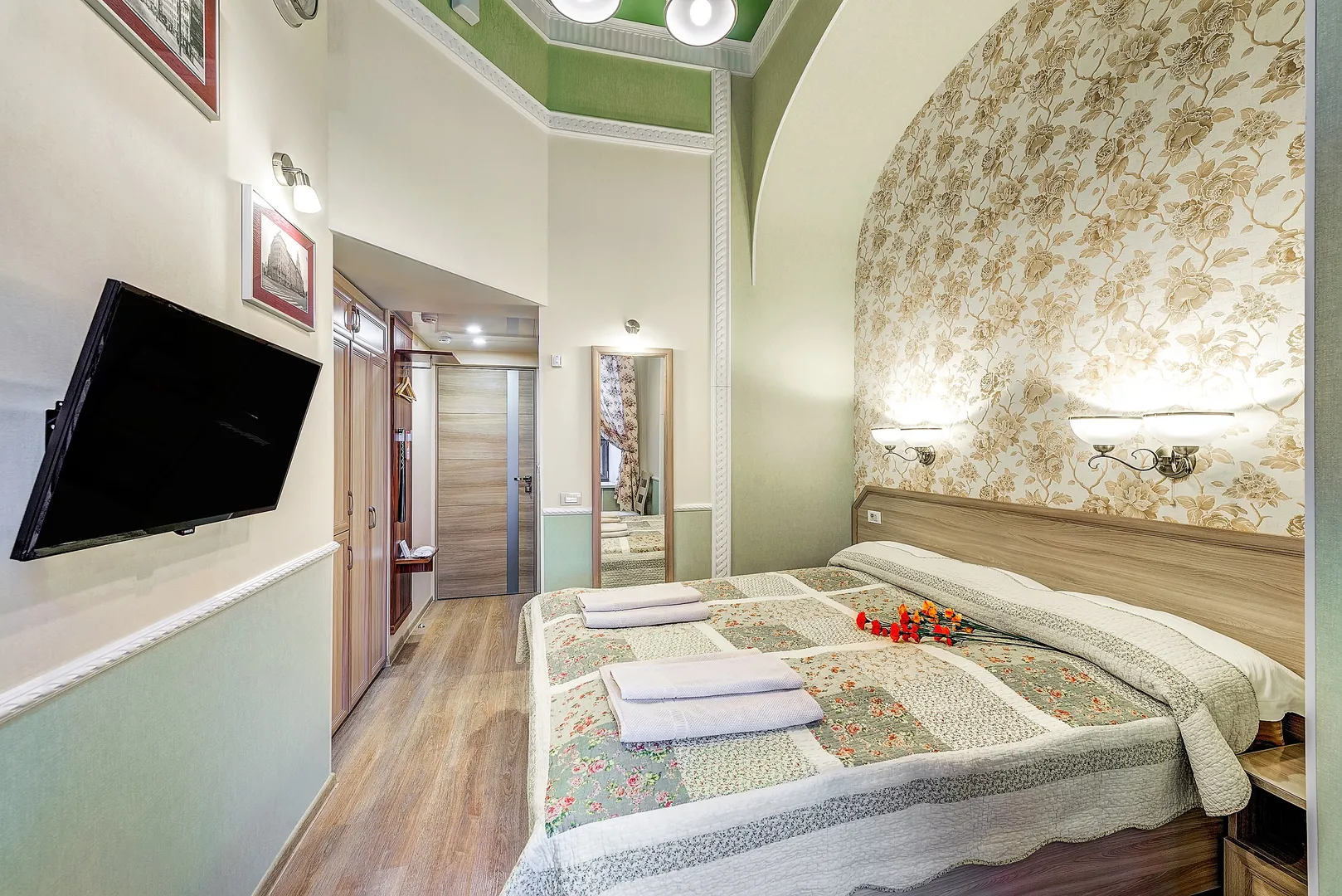 Номер оформлен в стиле "прованс", высокие потолки, вид на Садовое кольцо. В номере есть все необходимое: удобная кровать размером 160*200 см, холодильник, сейф, постельное белье, полотенца, халаты. В номере гостей ждет приветственный набор от отеля (чай, кофе, печенье) и бутылочка холодной воды. Номере имеется собственный санузел (душевая кабина, раковина, унитаз, мыло, шампунь, гель для душа, кондиционер, фен).