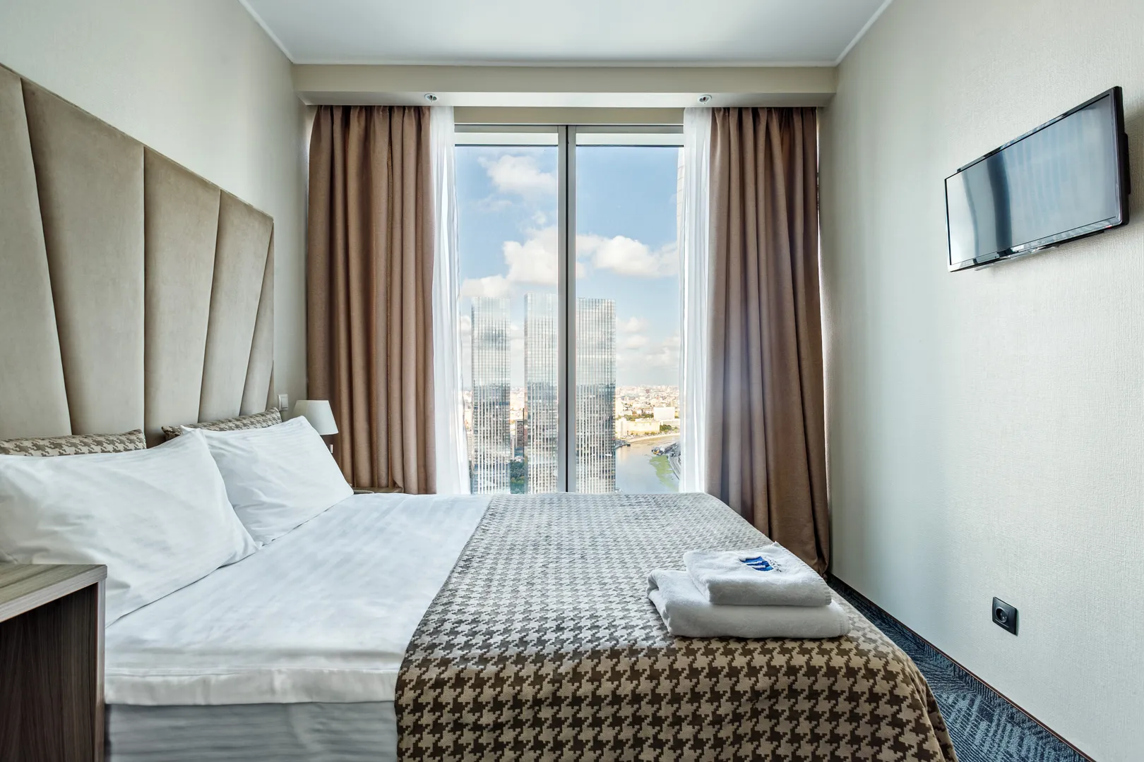 Дети до 7 лет можно бесплатно без предоставления дополнительного места. Размещаем с животными до 5 кг - 5000 рублей за весь срок проживания. Двухместный номер с великолепным панорамным видом с высоты 48 этажа башни Империя, с персональным санузлом и душевой кабиной и стандартной кроватью размером 140х200 см.