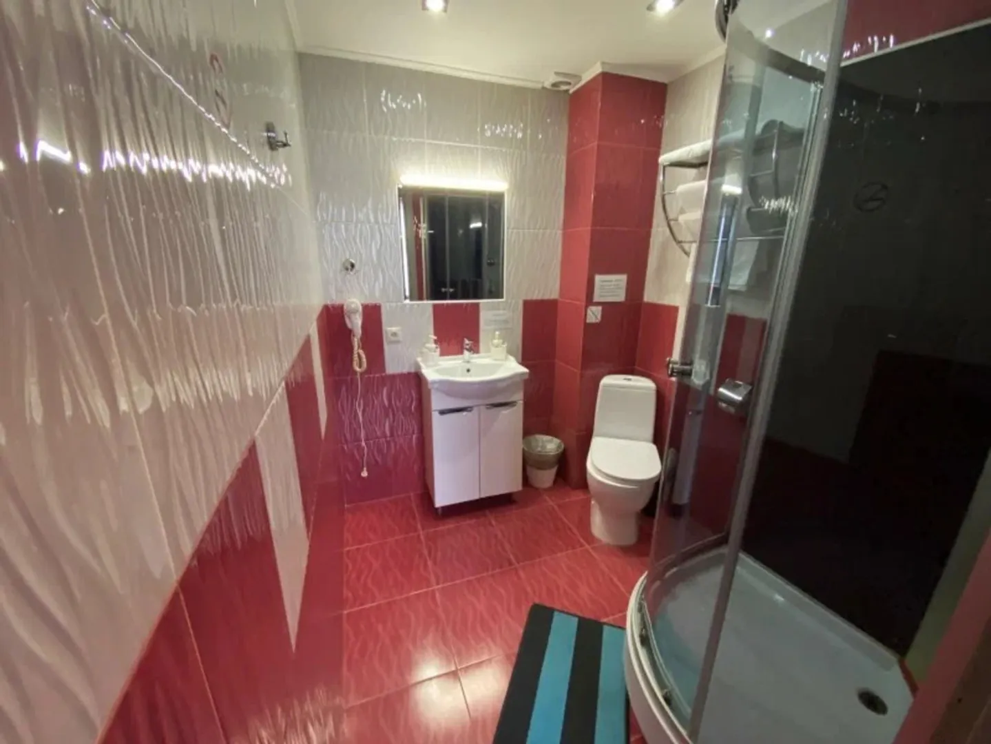 Ванная комната с современной душевой кабиной, феном, комплектом полотенец, халатов и туалетных принадлежностей.
