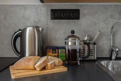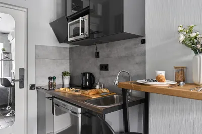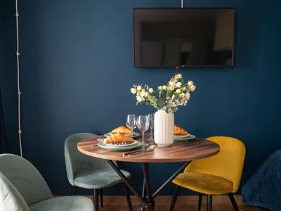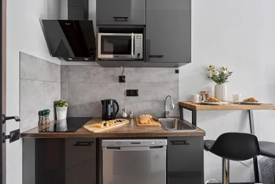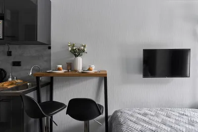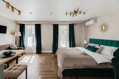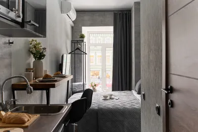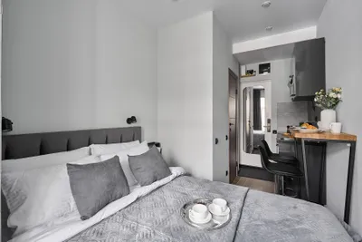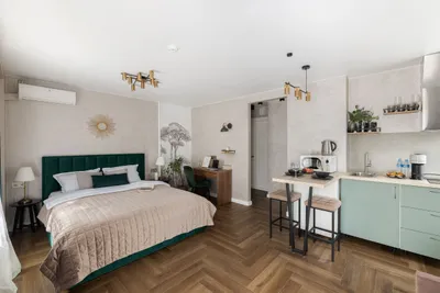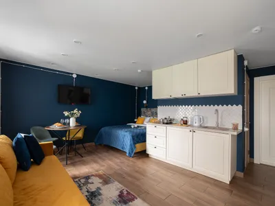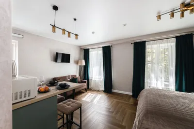 Уютные студии рассчитаны на 2 гостей и оснащены двуспальной кроватью с ортопедическим матрасом, Smart TV, светонепроницаемыми шторами, чистым постельным бельем, тапочками, утюгом и гигиеническими принадлежностями. В каждой студии имеется стиральная машина и кухонный уголок с