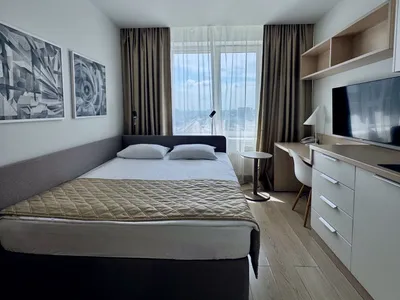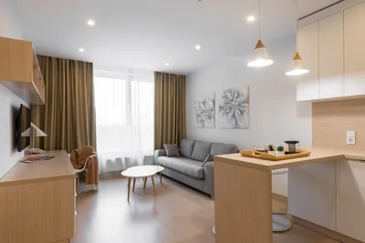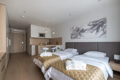 Апартамент оснащен: одной большой или двумя раздельными кроватями, рабочей зоной с письменным столом, полностью оборудованной кухней. Вид из апартаментов открывается на улицу или во двор.