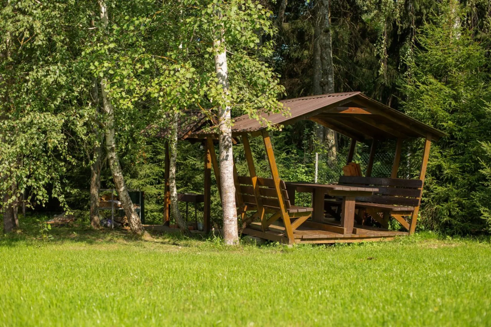 В глубине участка обособленно находится беседка для большой компании. Рядом оборудованный всем необходимым инвентарем мангал.