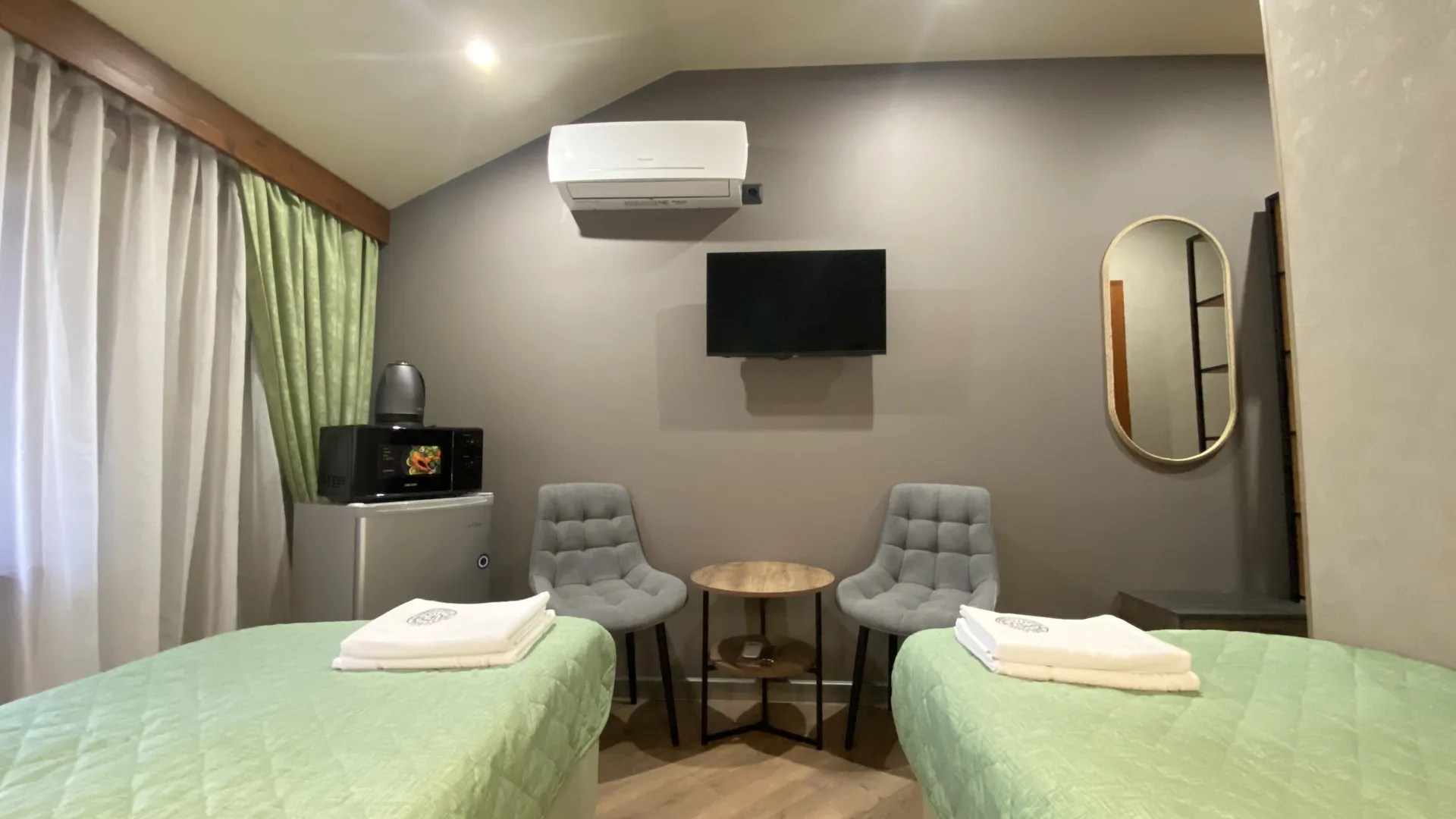 Уютные апартаменты 15 кв.м с двумя односпальными кроватями в евростиле. Есть все необходимое для комфортного отдыха: гигиенические принадлежности, мебель, посуда, бытовая техника и др. Красиво, хорошо и тепло!
