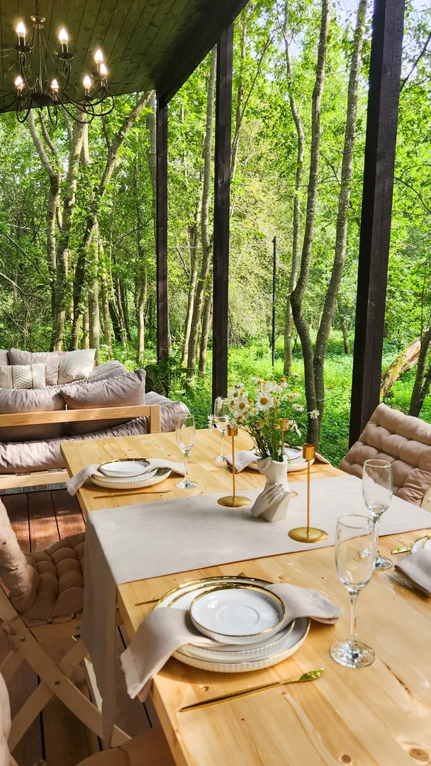 Снаружи домика обустроена открытая веранда мягкими креслами и столиком для наслаждения природой на открытом воздухе