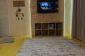 Просторная кухня: посуда, холодильник, плита, чайник, телевизор, детский стульчик, игрушки.