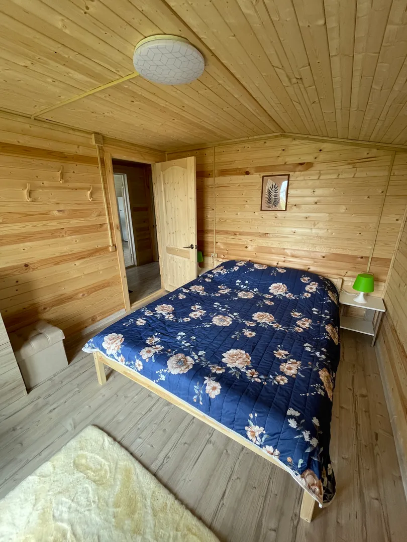 Расположен на участке 70 соток. В доме две спальни, одна с двумя раздельными кроватями (можно сдвигать вместе), и вторая с двуспальной. При необходимости доп.места, есть раскладной диван на кухне. В одной из спален установлен проектор для просмотра кинофильмов и мультфильмов. Также для детей есть настольные игры.
