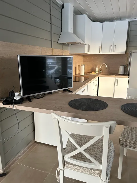 1. Кухня-гостиная с двухспальным диваном, оборудована холодильником, микроволновкой, духовкой, варочной панелью, чайником, посудой, телевизором. Есть интернет с подключенным к нему TV.