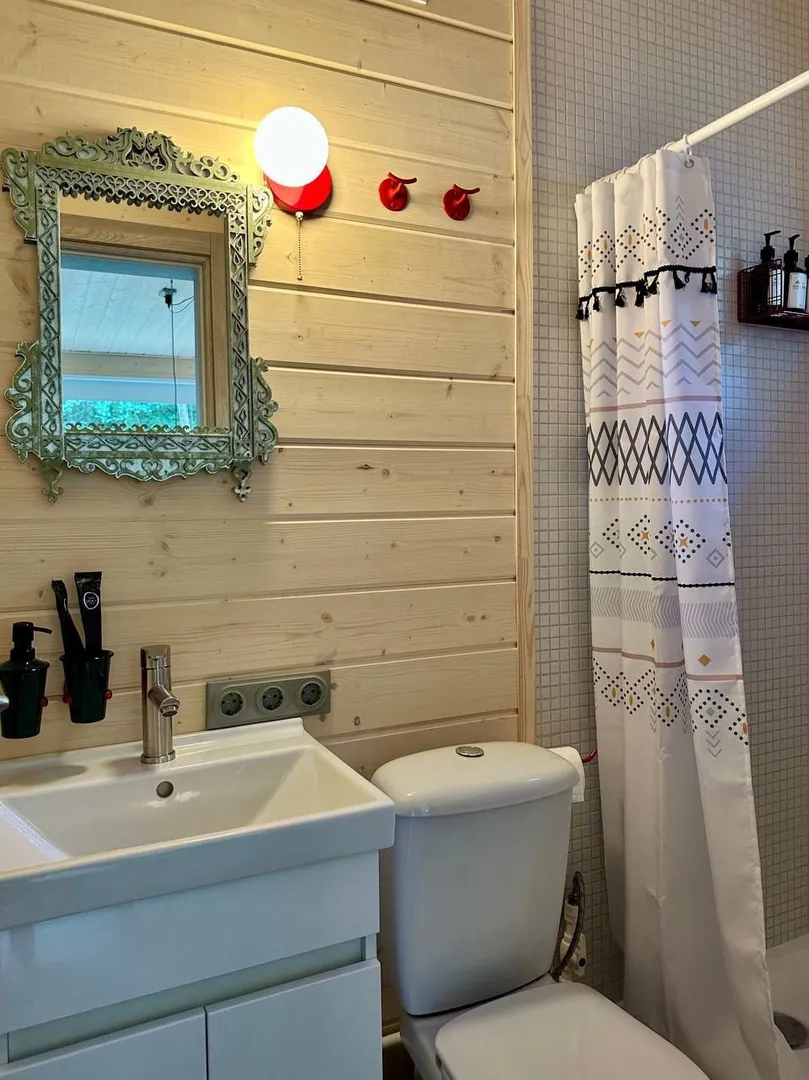 В каждом домике есть ванная комната, а в ней — душ, туалет и раковина с зеркалом.