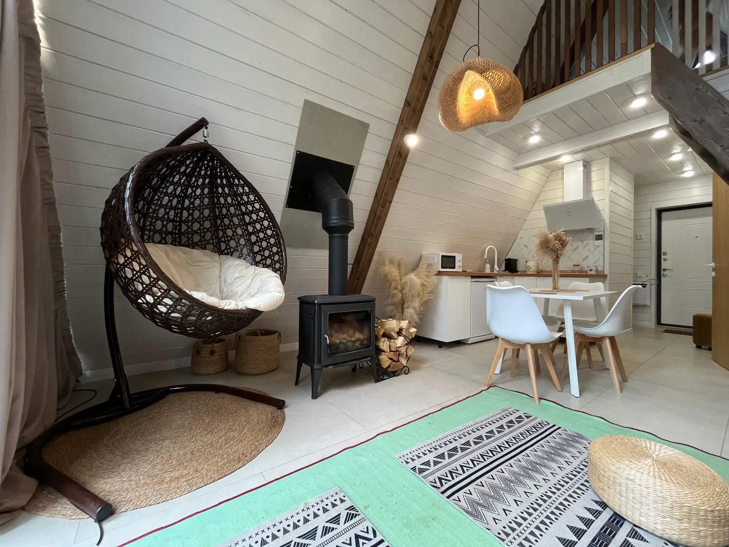 Дом Мечта это двухэтажный домик в стиле а фрейм площадью 55 кв.м. на берегу озера. Дом построен в светлых тонах в стиле бохо, имеет второй свет и панорамное остекление. На первом этаже находится гостиная с кухней, санузел с душевой, на втором этаже располагается комфортная двуспальная кровать.